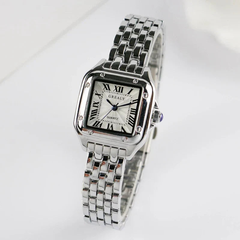 Classic square wristwatch with a silver steel band. Features a minimalist quartz movement design for timeless elegance.